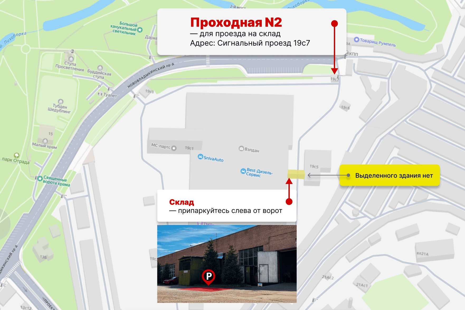 - Если вы на машине: перед проходной №2 удобно припаркуйтесь, подойдите к проходной N2 (19с7), чтобы получить пропуск, после чего сможете проехать на территорию. Пропуск нужно заказывать заранее (выезд возможен только с нашим пропуском и печатью на нем).